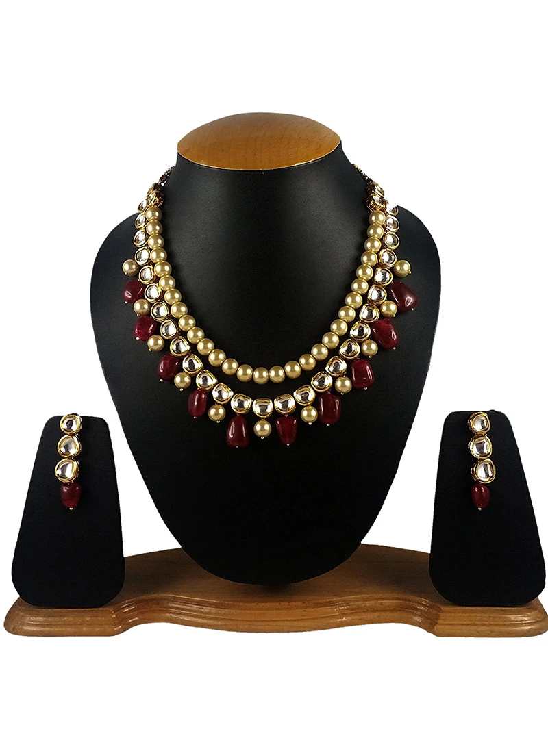Gold plated layered necklace set with white kundans and beige beads all over it along with beige and maroon beads dangling from it. Comes with matching pair of earrings.
