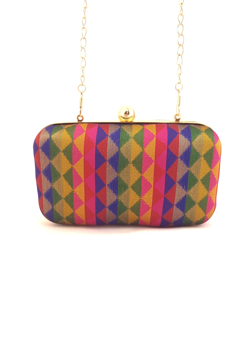 This multicolor silk designer clutch comes with embroidered work and comes with long sling chain.