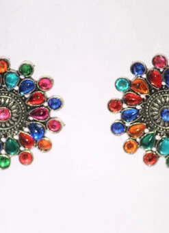 Silver plated stud earrings with decorative designs and multicoloured stones studded on the earrings.