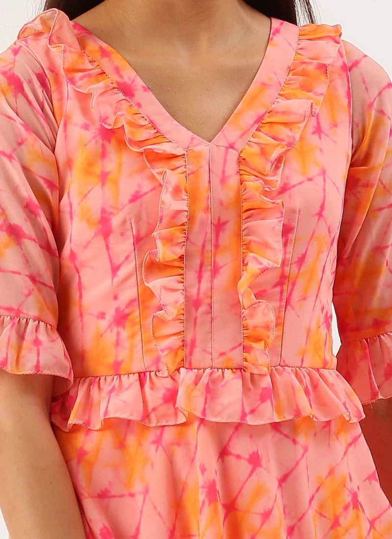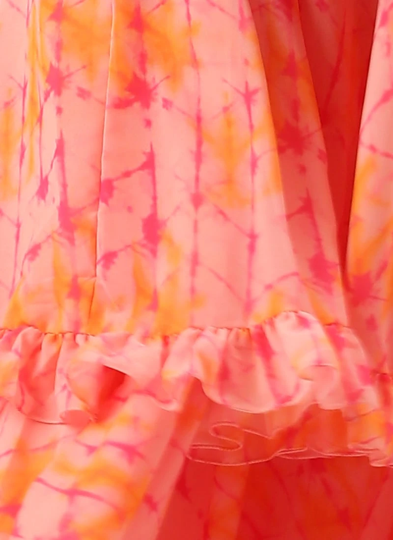 Presenting a multicolor tired georgette flared gown, with natural waist length yoke, features a low v neckline in front and high neck at back, elbow sleeve along with side zipper opening and an equally distributed tiered gathers flare..