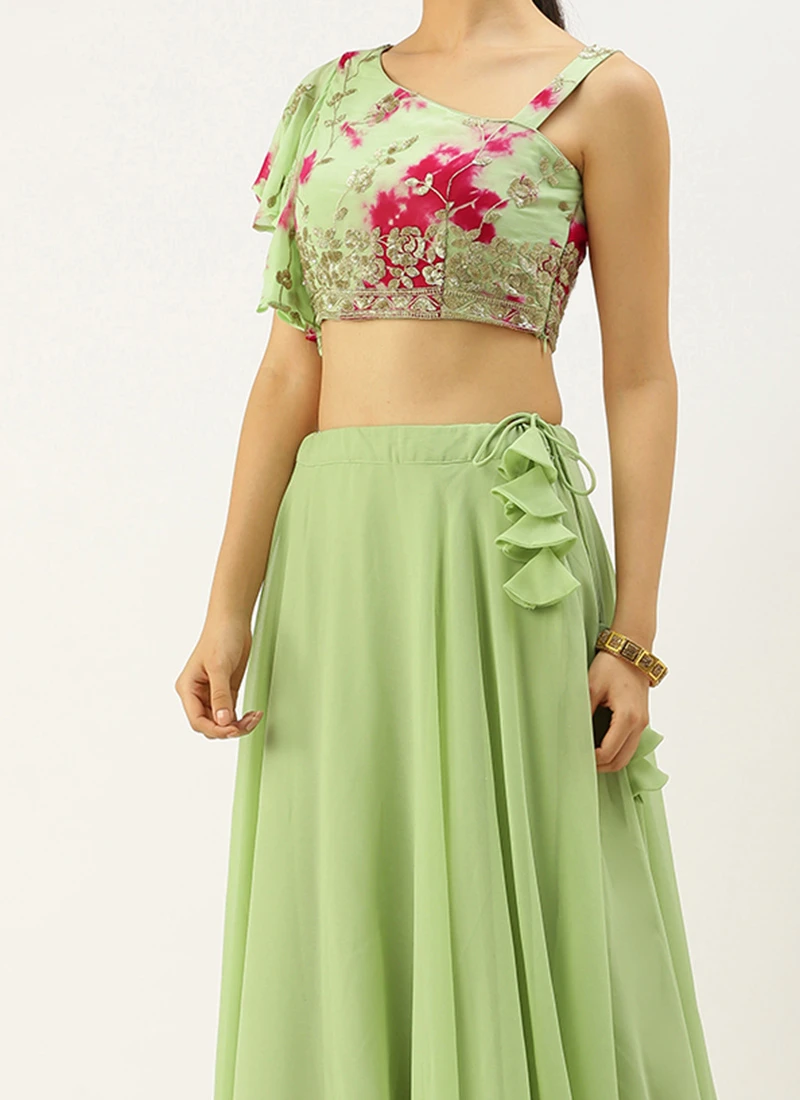Multicolored Sequins N Green One Shoulder Lehenga Set Festive Wear