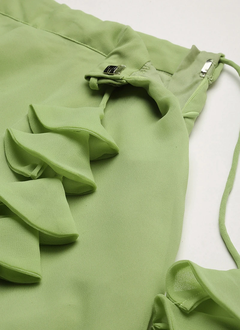 Green one shoulder lehenga sets, the blouse has multicolored sequins fabric, features a one-shoulder with strap neckline in the front and back, half-circular short sleeve on one side, side zipper closure, blouse length is till natural waist-length, paired up with green georgette fabric bottom which has full-circular flare with drawstring waist along with fabric tassels and length is till floor-length, come with beige embroidered net dupatta which has a golden embellished border on the edges..