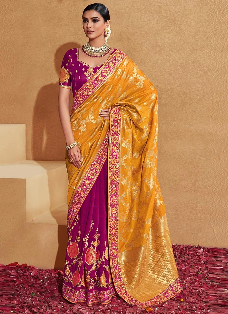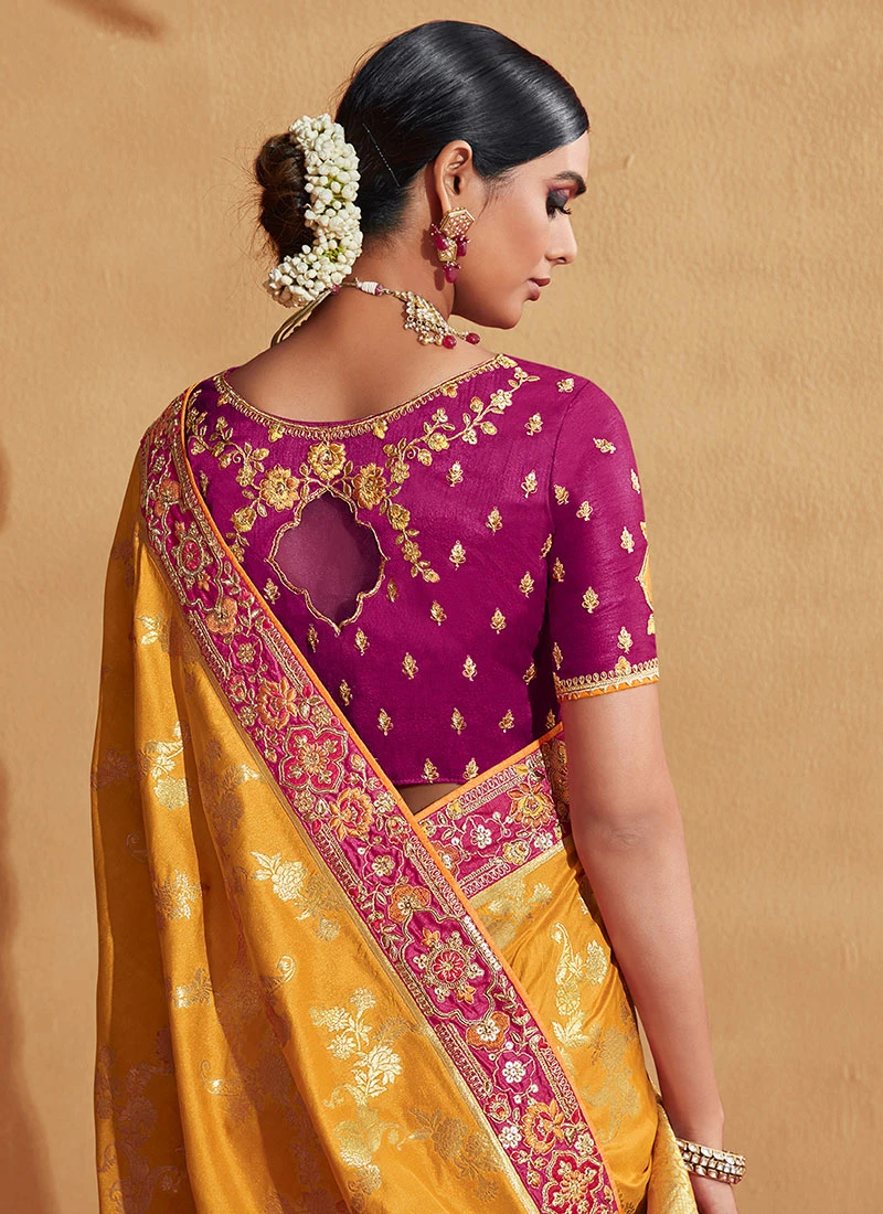 Mustard And Magenta Color Jacquard Embroidery Art Silk Saree Party Wear