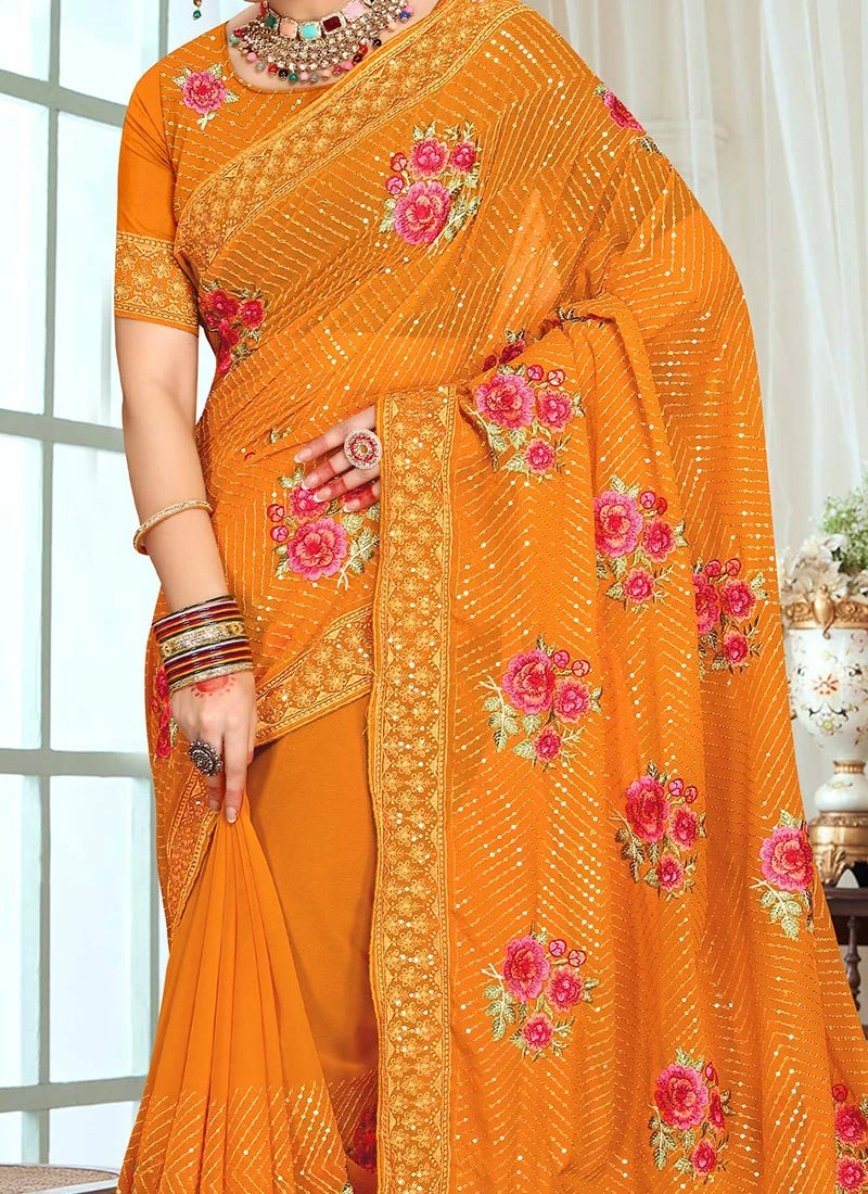 Mustard Georgette Embroidery N Sequins Saree Party Wear