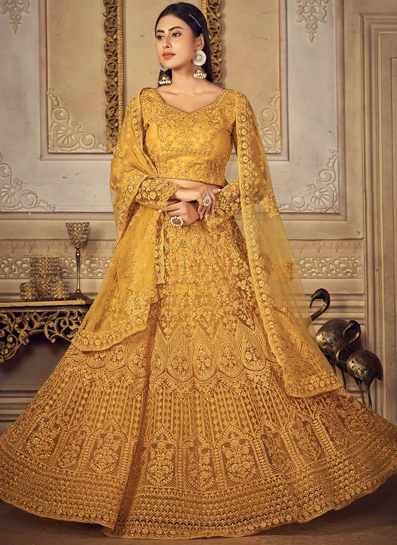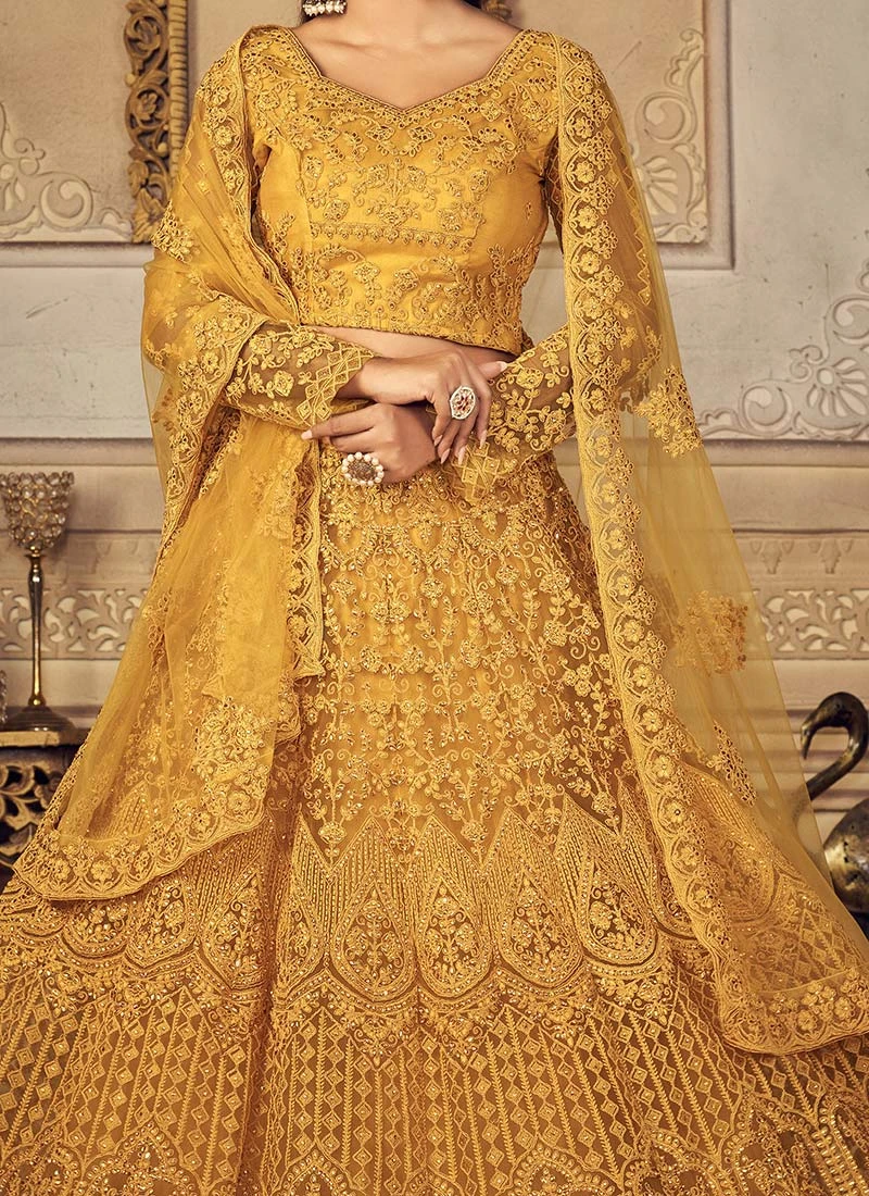 Mustard Net Embroidered N Stones Umbrella Lehenga Party Wear