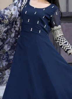 Crafted from highquality art silk this Navy Blue Anarkali Suit is a testament to luxurious comfort and style. The deep navy blue hue of the fabric adds a touch of regal charm and versatility to the outfit making it suitable for various events and festivities. The art silk material drapes beautifully ensuring that you look resplendent from every angle.