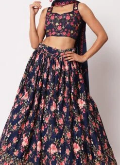 Navy Blue Banarasi Silk Printed Umbrella Lehenga Party Wear