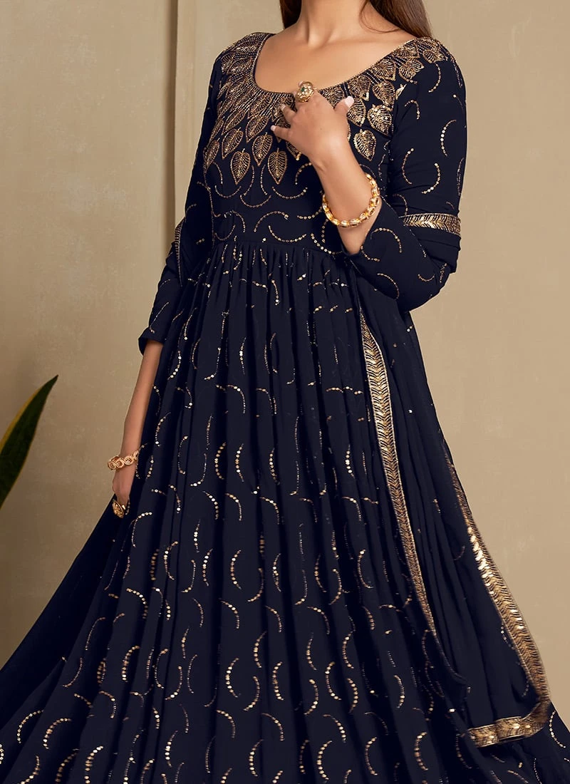 In conclusion the Navy Blue Faux Georgette Sequins Dresses and Gown are a testament to timeless beauty and sophistication. These garments are designed to make you feel like a star allowing you to radiate confidence and charm at any event. With their captivating navy blue hue and intricate sequin work they are a musthave addition to any fashionforward wardrobe. Elevate your style embrace the shimmer and step into the spotlight with these enchanting pieces.