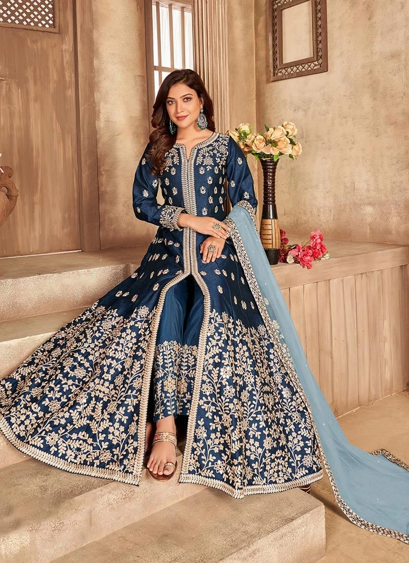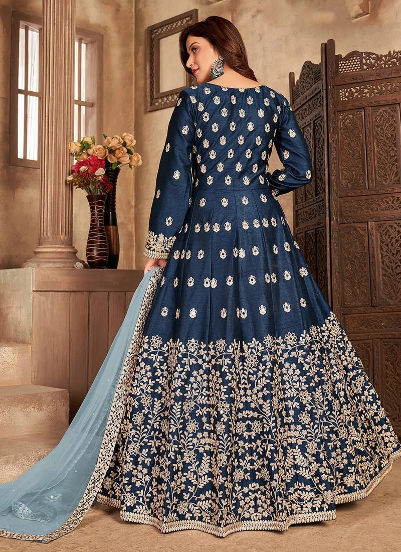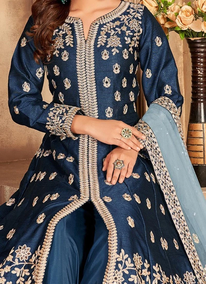Navy Blue Soft Art Silk Mirror Embroidery Anarkali Suit Party Wear