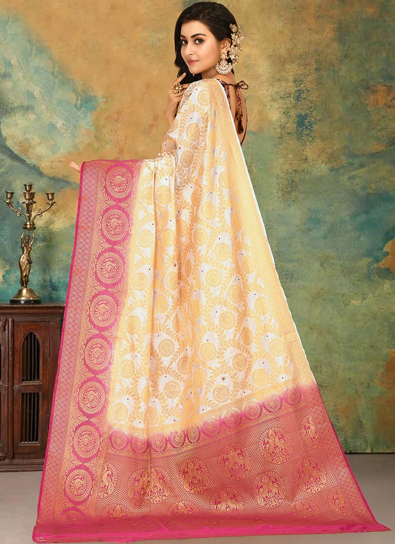 Off White N Pink Kanjeevaram Silk Weaving Saree Festive Wear