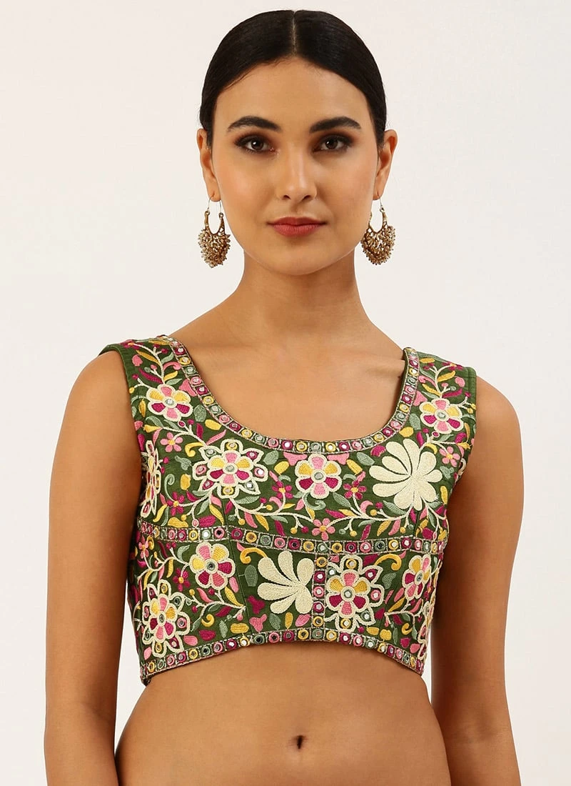 A delightful look comes when you wear this olive green color silk readymade blouse encrafted with embroidery and mirror work. It features a U neck and sleeveless and very low back neckline with back hook and knot type.