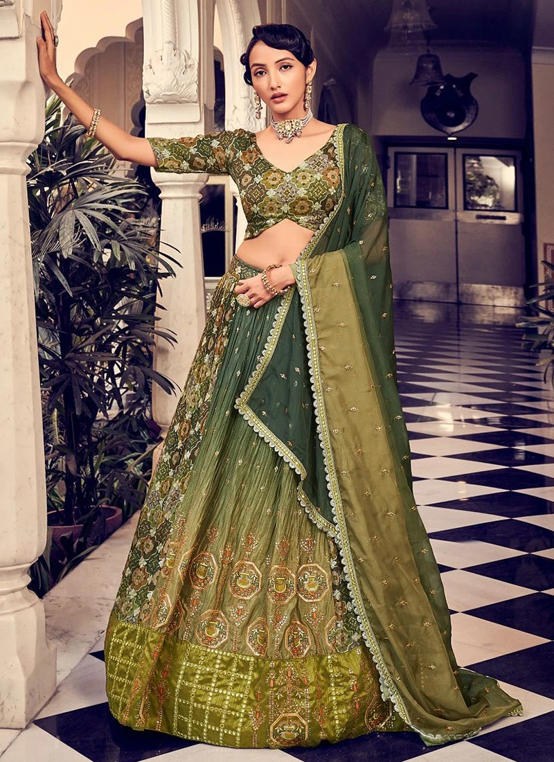 Comes with semi -stitched lehenga, un stitched choli and dupatta fabric. To have it stitched, please select the custom tailoring options. Lehenga with elaborate patterns and colors are used for photo-shoot. Color and pattern of the lehenga might not be as shown in the image.