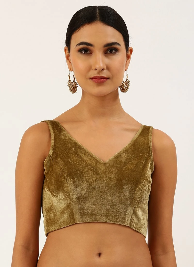 Presenting a olive green color velvet readymade blouse and crafted with V neckline in front and back and sleeveless with back hook.