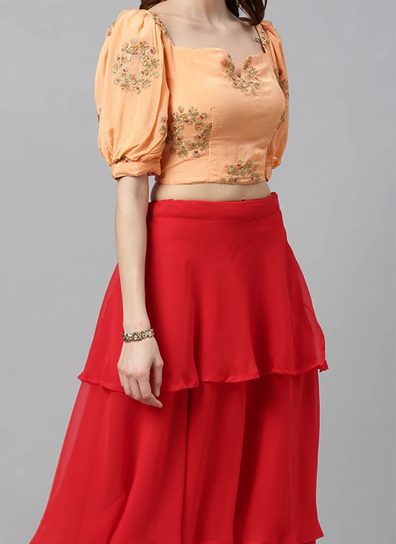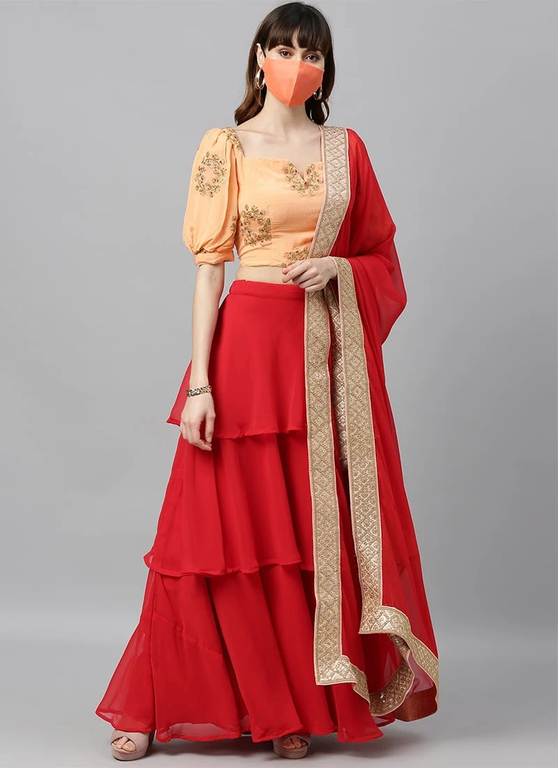 Presenting a peach embroidered chiffon blouse and maroon georgette fabric layered lehenga set, the blouse is of peach embroidered fabric and has styled with low square sweetheart neckline in front and high wide boat neckline in back, puff elbow sleeves, the blouse length is till natural waist level, comes with side zip closure, the lehenga is of layered maroon georgette fabric comes with contoured waistband with hooks and zipper to complete the overall look, it comes with a matching maroon georgette fabric dupatta adorned with stunning light pink embroidered lace on all its four sides.Cancan is preferred for voluminous flare. Mask only for shoot purpose.Refer the fabric image for true color of the dress. This dress is custom designed from fabric and custom stitched. Once sold cannot be returned.Designs, colors, and patterns on the actual product may slightly vary from designs shown in the image. Images are the only representative