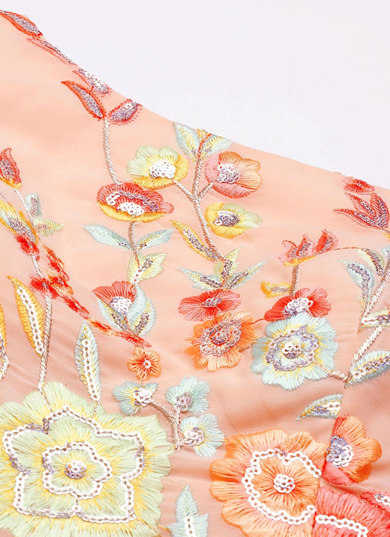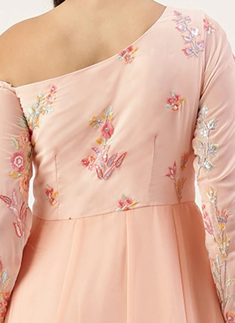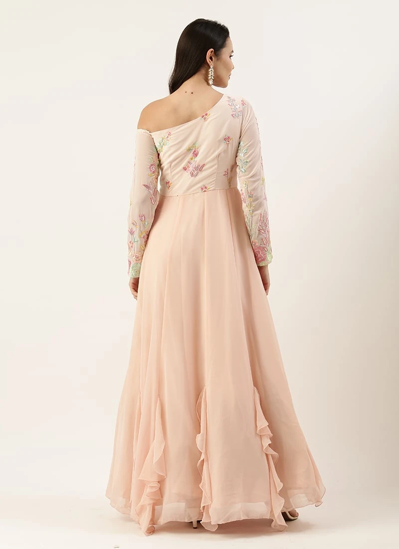 Peach Embroidered One Shoulder Ruffle Gown Party Wear