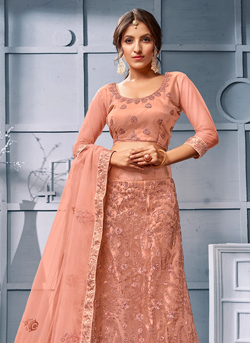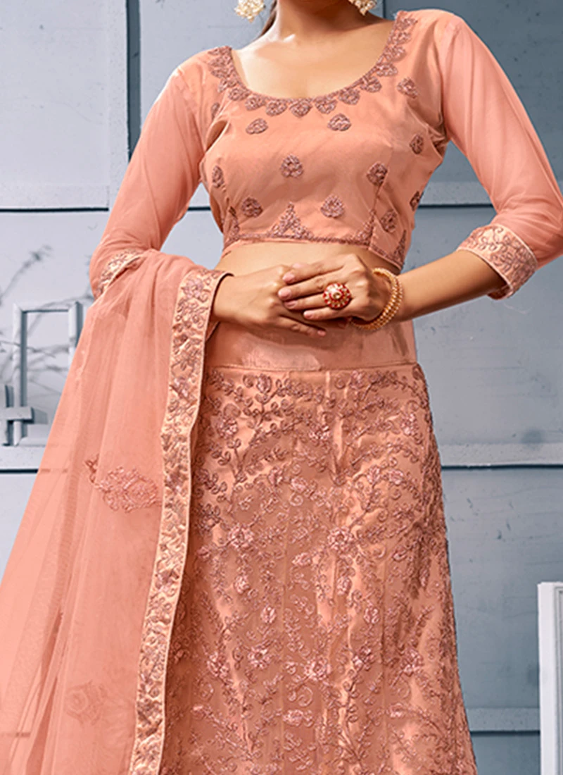 Peach Net Machine Embroidered A Line Lehenga Party Wear