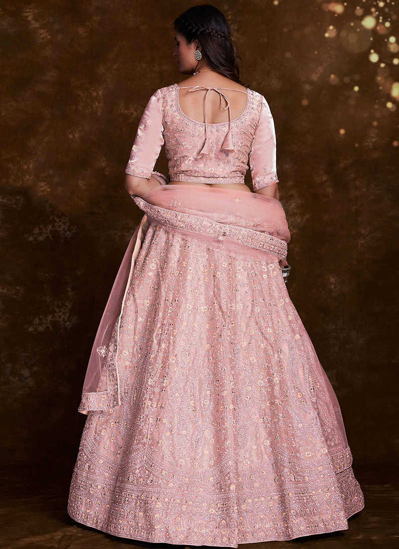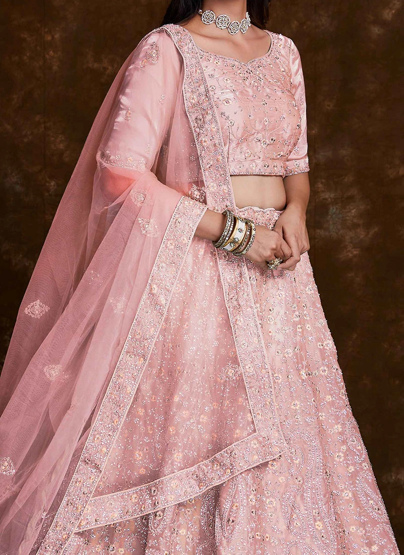 Comes with semi -stitched lehenga, un stitched choli and dupatta fabric. To have it stitched, please select the custom tailoring options. Lehenga with elaborate patterns and colors are used for photo-shoot. Color and pattern of the lehenga might not be as shown in the image.