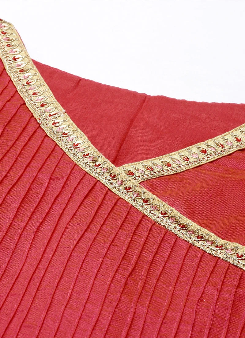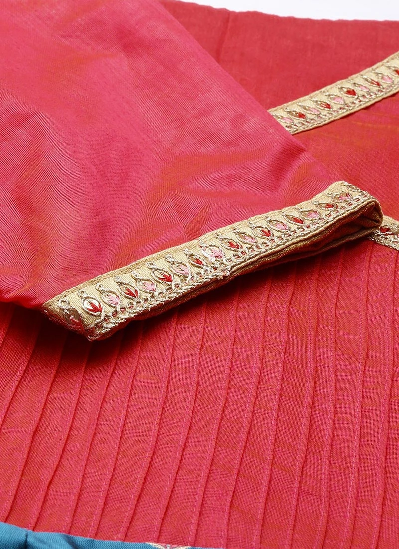 Presenting blue and pink overlap neck front and high back neck pattern top with kali attached at the natural waist yoke till calf length and is enhanced with tucks and a side dori with tassel and puff elbow length sleeves. A trim is attached to the neckline and sleeves. The floor length half circular pink chanderi lehenga has a front band and back elastic waistband type with can can attached to it and the pink net dupatta has a trim attached at the four corners. .