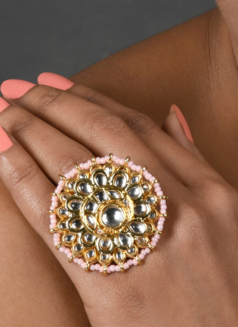 Golden plated designer ring decorative with kundan studded and pink beads stringed on the rings.