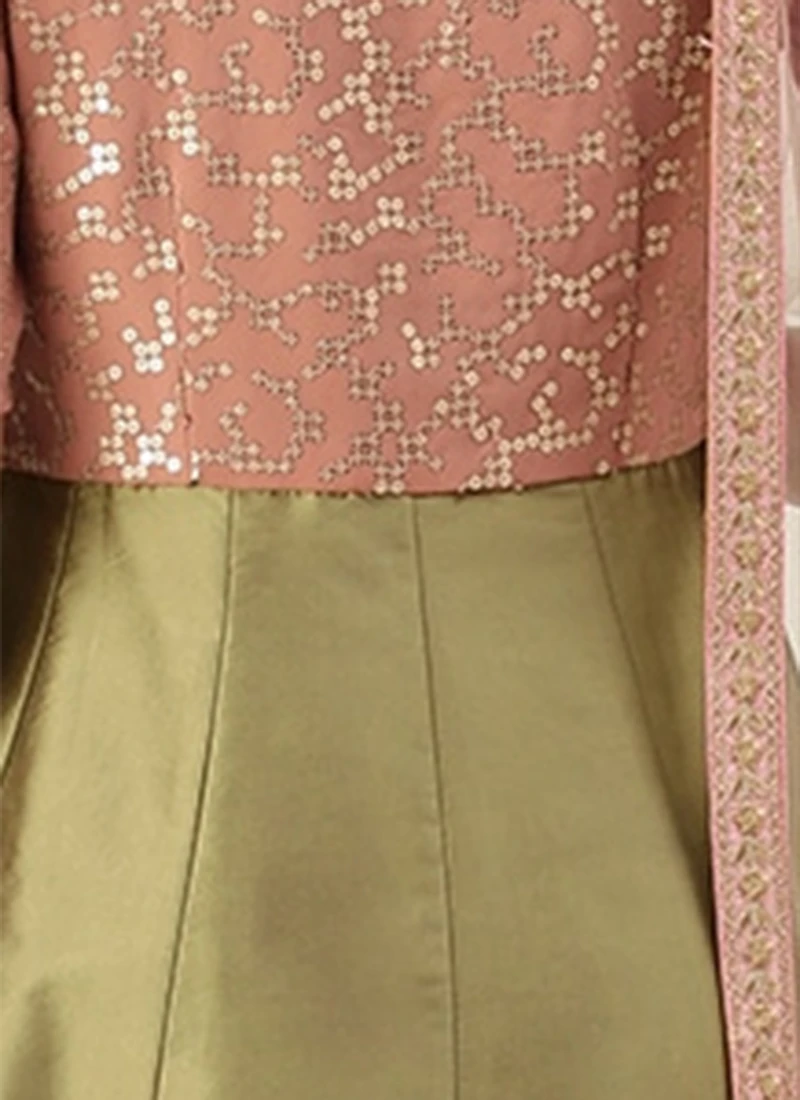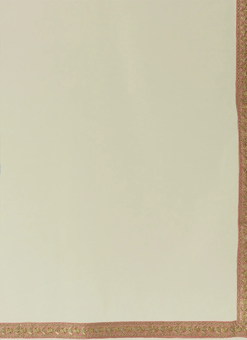 Presenting a kali anarkali, features pink embroidered georgette yoke with boat neckline both in front and back, puff elbow sleeves, yoke until natural waist, followed by prairie sand taffeta12 kali flare until floor length and has side zip closure. Comes with a beige net dupatta with a pink embellished border. It is paired up with a prairie sand taffeta narrow straight pant bottom until ankle length with band with elastic waist..