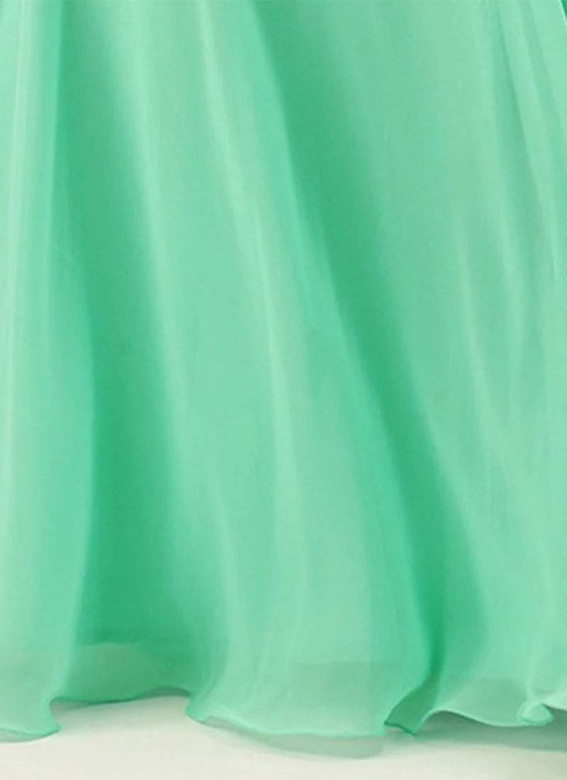 Presenting a pink embroidered and turquoise georgette gown, features overlapping style, with round neckline in the front and high neckline in the back, elbow sleeves, natural waist-length yoke, half-circular flare until floor-length, comes with back zip opening..