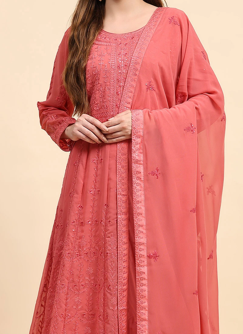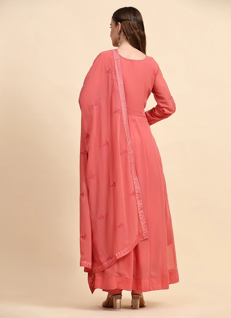 Careful attention to detail is evident in the stitching and finishing of the suit ensuring durability and longevity. The Pink Faux Georgette Embroidered Anarkali Suit is a timeless piece that seamlessly blends tradition with contemporary style making it a musthave in every fashionconscious womans wardrobe. Whether its a wedding celebration festival or any special occasion this Anarkali suit is sure to make a statement and leave a lasting impression on everyone.