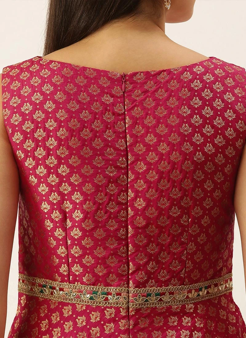 Presenting a pink jacquard gown, features front and back boat neckline, yoke until natural waist length with draped from shoulder to waist, sleeveless, followed by a half-circular flare until floor-length comes with back zip opening..