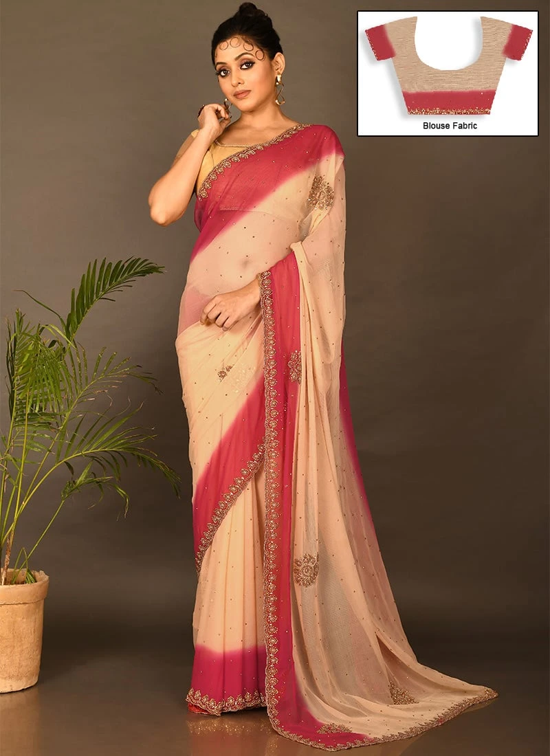 Pink N Green Georgette Hand Work Half N Half Saree Festive Wear