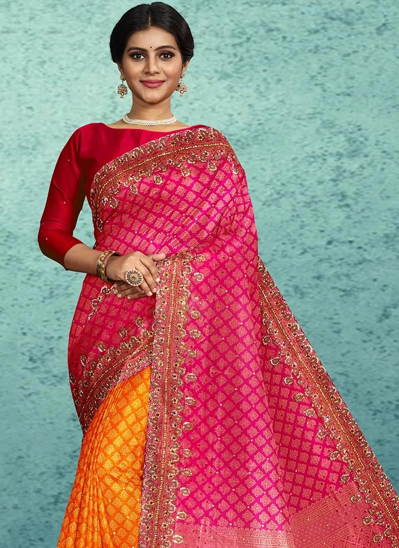 Pink N Rust Kanjeevaram Silk Hand Embroidery Half N Half Saree Festive Wear