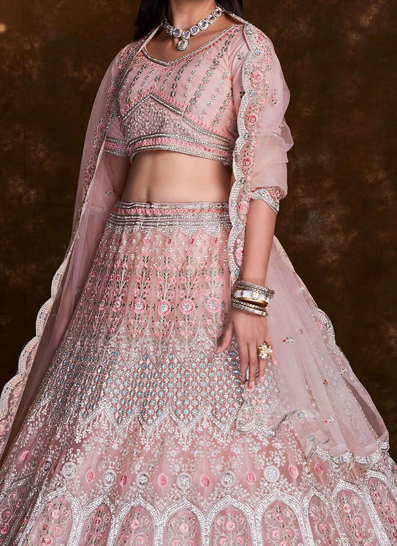 Comes with semi -stitched lehenga, un stitched choli and dupatta fabric. To have it stitched, please select the custom tailoring options. Lehenga with elaborate patterns and colors are used for photo-shoot. Color and pattern of the lehenga might not be as shown in the image.