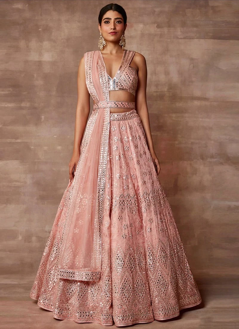 Comes with semi -stitched lehenga, un stitched choli and dupatta fabric. To have it stitched, please select the custom tailoring options. Lehenga with elaborate patterns and colors are used for photo-shoot. Color and pattern of the lehenga might not be as shown in the image.