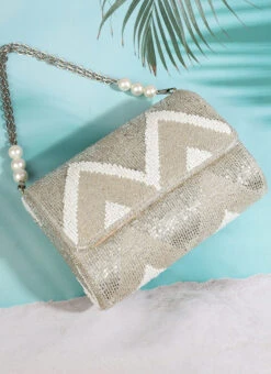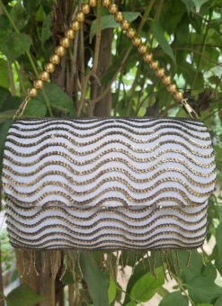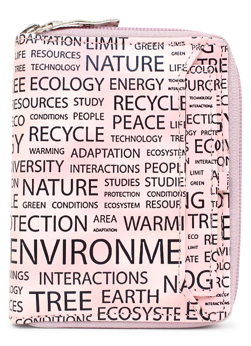 The designer pink polyster clutch with some designs and zipper closure.