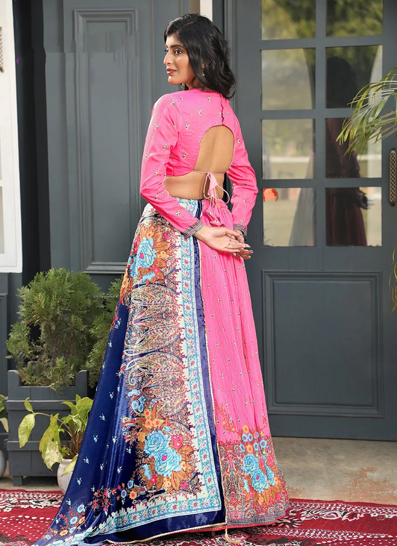 Pink Satin Silk Digital Printed Work A Line Lehenga Navy Blue Dupatta Festive Wear