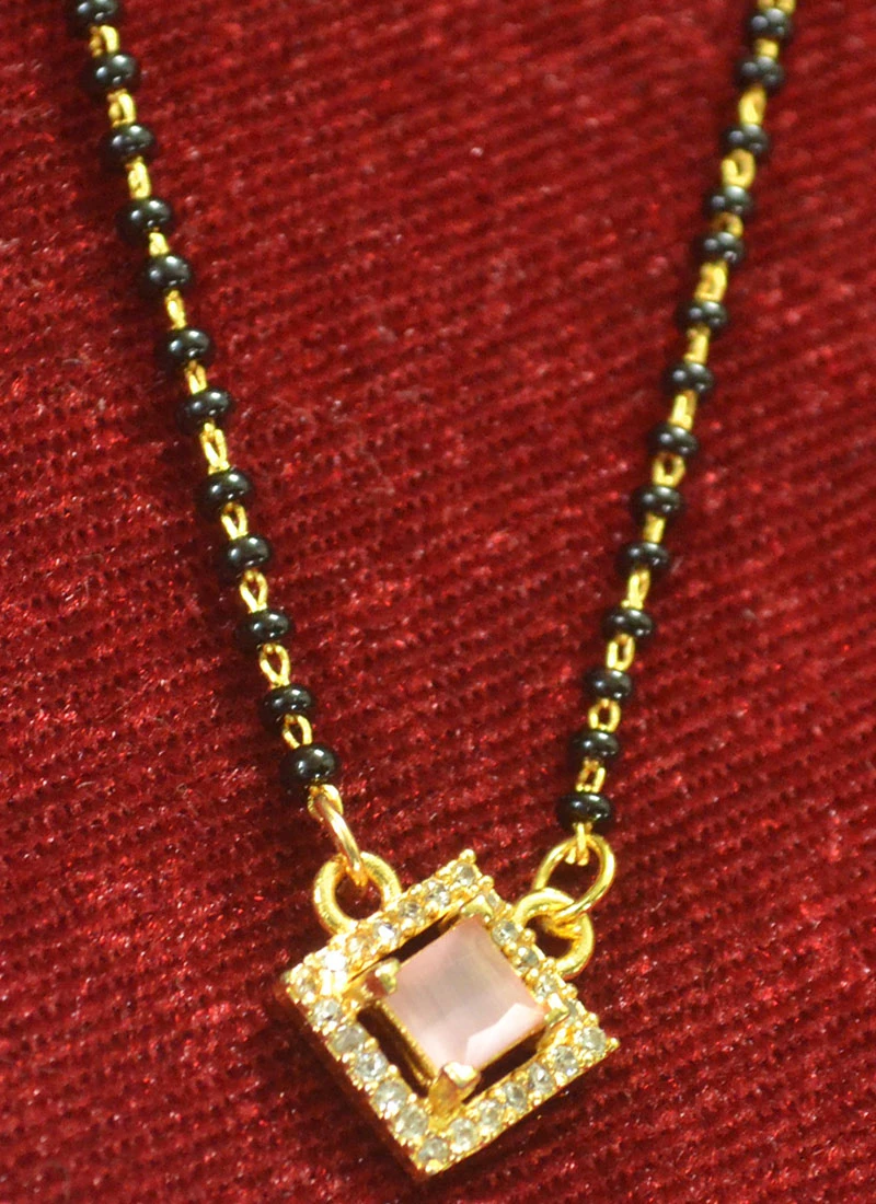 Golden Plated Long Traditional Mangalsutra crafted with pink n white stones work with simple one line chain with black beads.