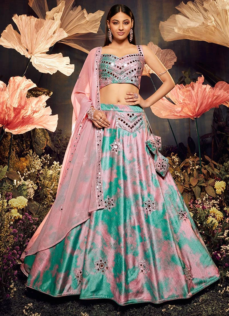 Comes with semi -stitched lehenga, un stitched choli and dupatta fabric. To have it stitched, please select the custom tailoring options. Lehenga with elaborate patterns and colors are used for photo-shoot. Color and pattern of the lehenga might not be as shown in the image.