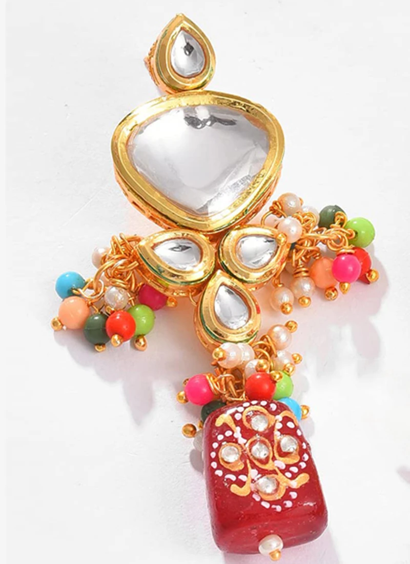 The deep mesmerizing hue of red alloy forms the base of these danglers providing a striking contrast to the delicate gold detailing. Kundan a traditional form of Indian gemstone jewellery finds its roots in the royal courts of Rajasthan. Each Kundan stone is set meticulously into the alloy creating a mosaic of intricate patterns that captivate the beholders gaze. The vibrant red colour symbolizes passion love and prosperity making these danglers not just adornments but symbols of auspiciousness and celebration.