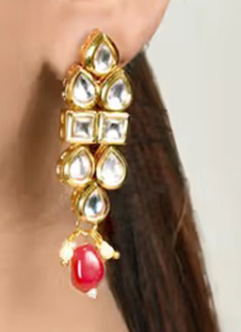 The golden plated necklace set comes with kundan studded on it and red color beads dangling on the necklace looks pretty. Comes with matching earrings.