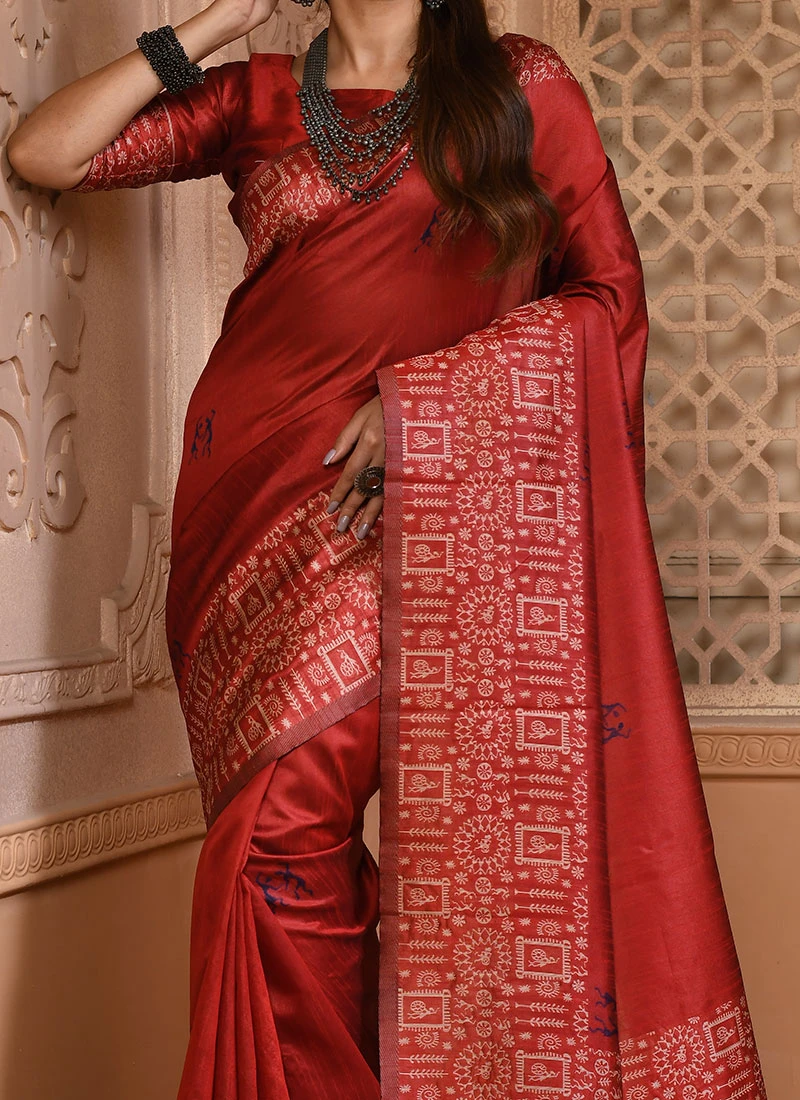 Red Handloom Raw Silk Zari Woven Work Saree Festive Wear