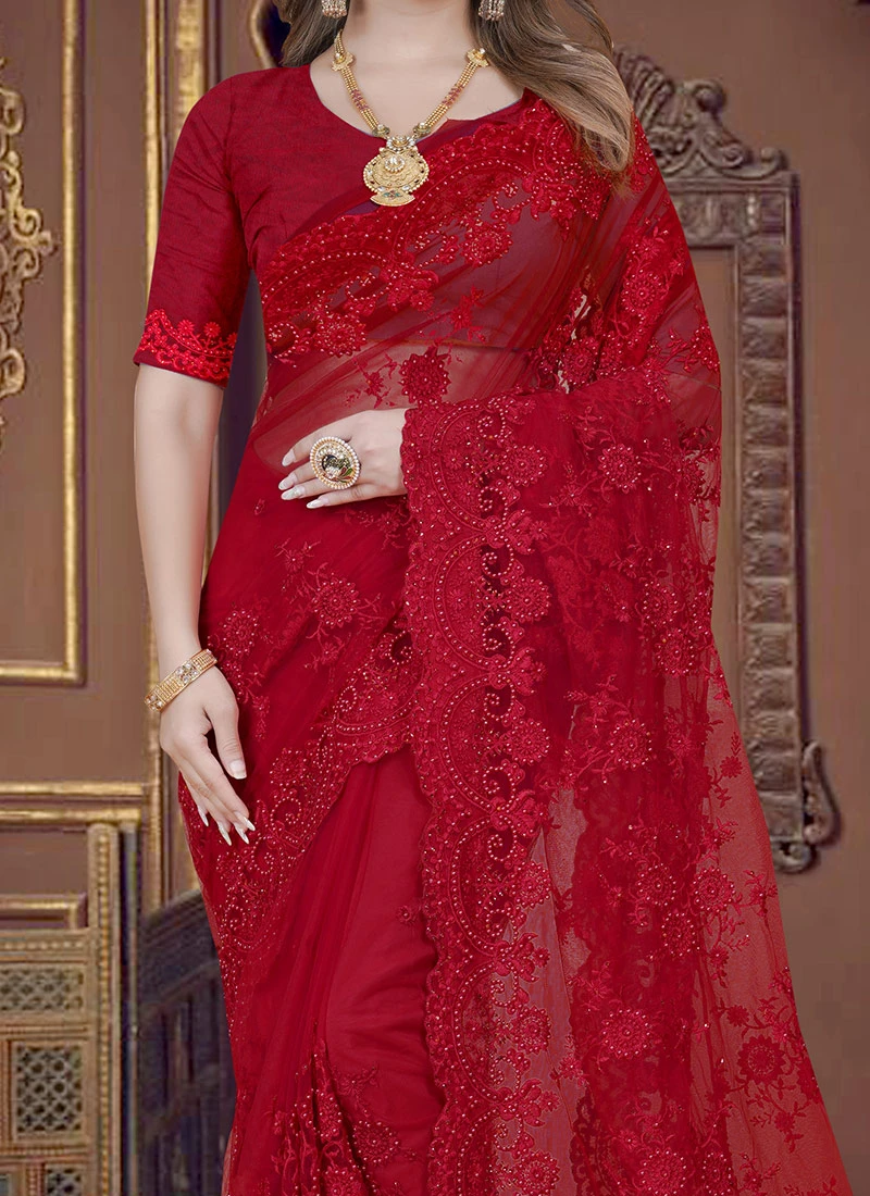 In summary the Red Net Embroidered Sari is a testament to Indias rich textile heritage and artistic craftsmanship. Its sumptuous net fabric deep red hue intricate embroidery and versatile design make it a timeless piece of attire that effortlessly combines tradition and contemporary style. When you wear this sari youre not just wearing clothing youre wearing a piece of art that tells a story of elegance and beauty. Its a sari that will make you stand out and leave a lasting impression wherever you go truly embodying the essence of timeless elegance.