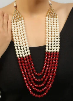 The Ruby and White Alloy Kundan Necklace is a stunning piece of jewellery that effortlessly combines traditional craftsmanship with contemporary design. This exquisite necklace features a mesmerizing blend of radiant rubies and sparkling white kundan stones set meticulously in a lustrous alloy base. The vibrant red hue of the rubies contrasts beautifully with the timeless elegance of the white kundan stones creating a harmonious balance that captures attention.