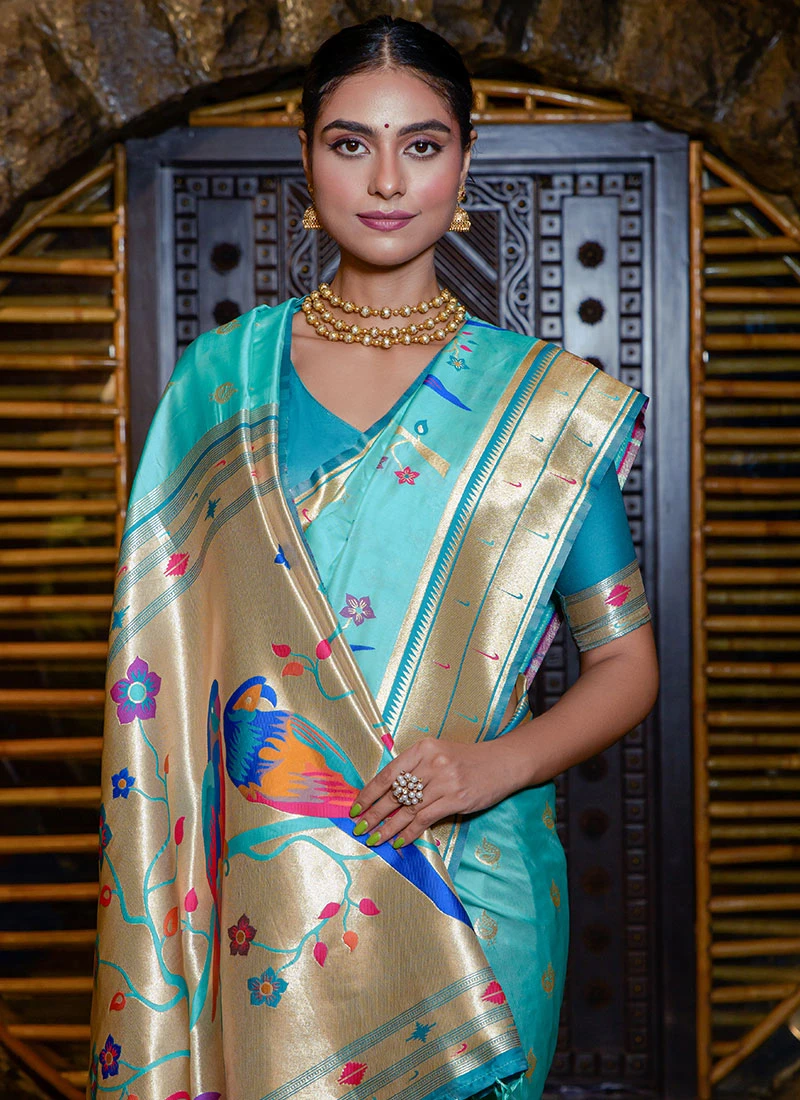 Sea Green Color Paithani Silk Saree With Meenakari Zari Woven Festive Wear