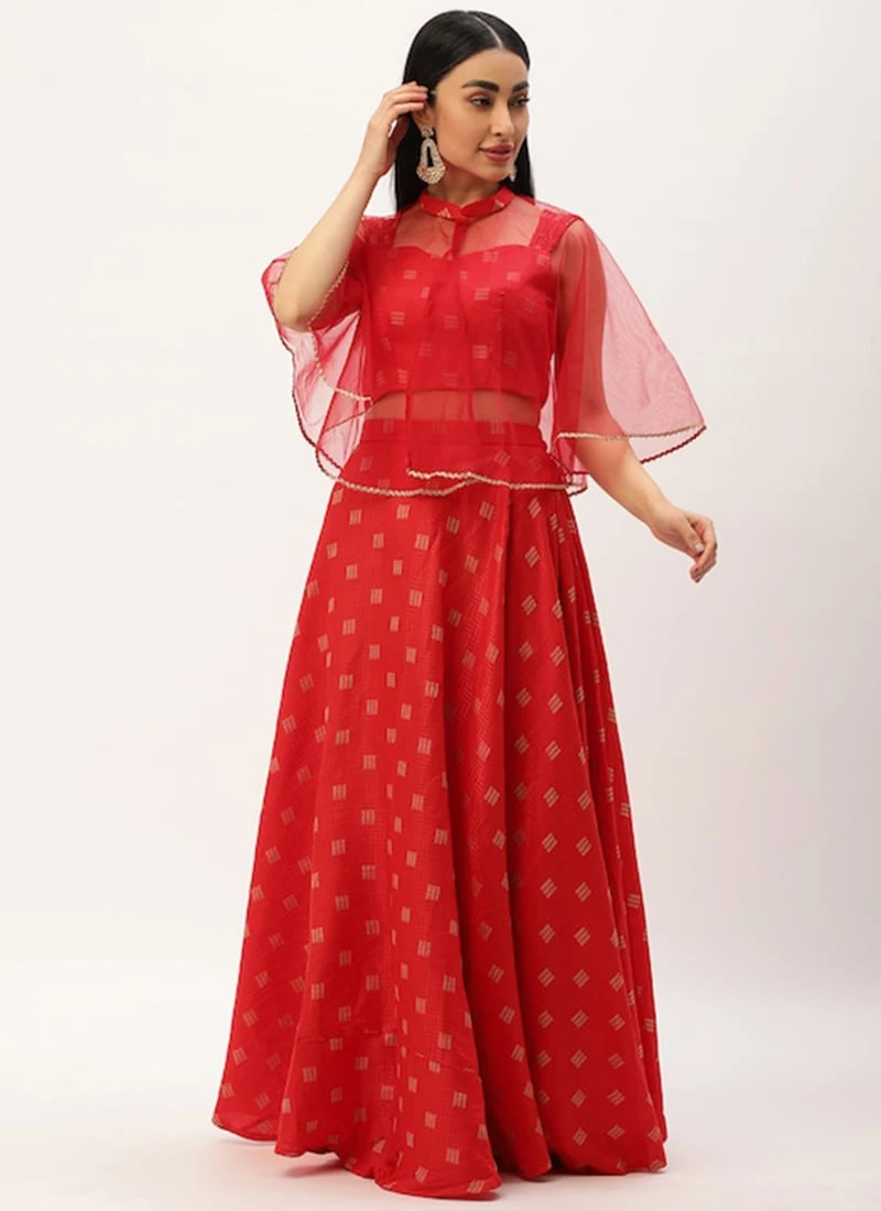 Skirt From Red Jacquard Crop Top N Skirt With Cape After Six Wear