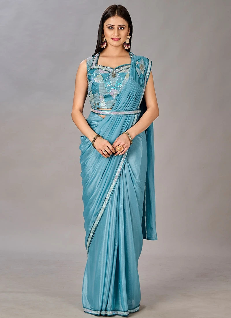 In summary the Sky Blue Faux Georgette Shimmer Saree is a symbol of grace beauty and sophistication. Its exquisite craftsmanship combined with the choice of fabric and color makes it a timeless piece in every womans wardrobe. Whether its a grand celebration or a special occasion this saree is sure to make a lasting impression turning heads and garnering compliments wherever you go.