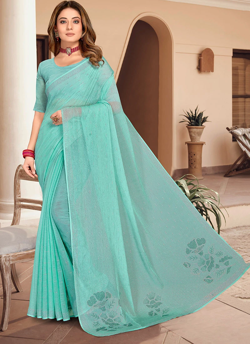 Sky Blue Shimmer Chiffon Tikki Work Saree Party Wear