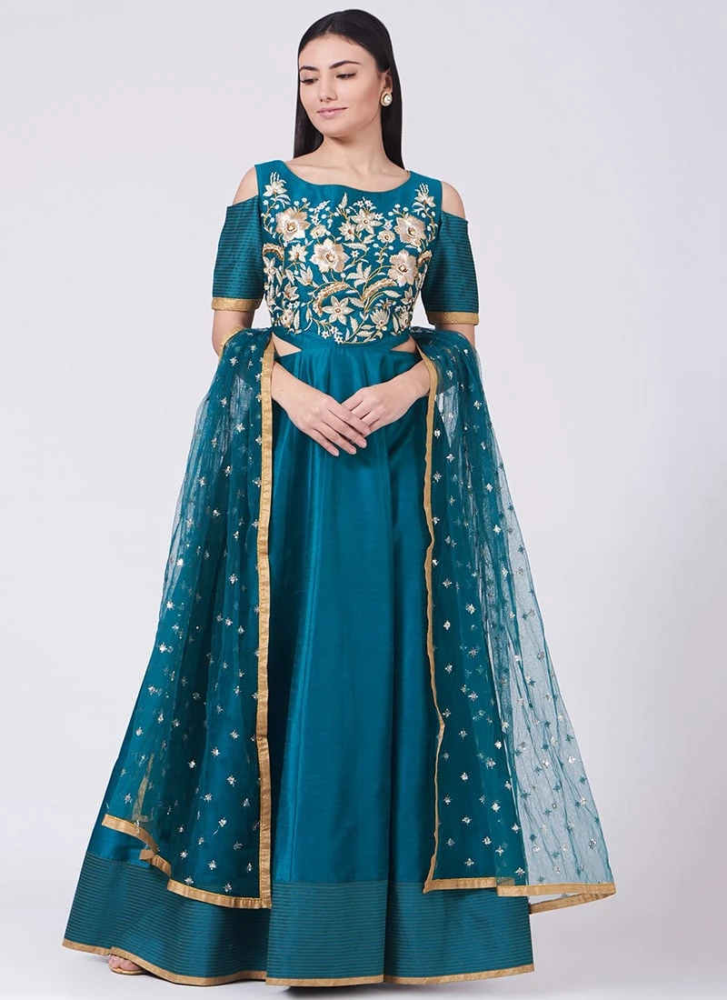 Grey N Green Silk Zari Embroidery Work Half N Half Saree Party Wear