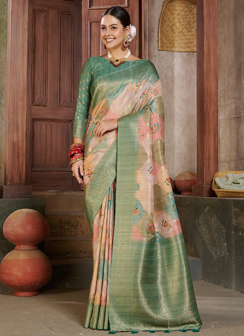 Teal Green Cotton Silk Woven Printed Work Saree Festive Wear