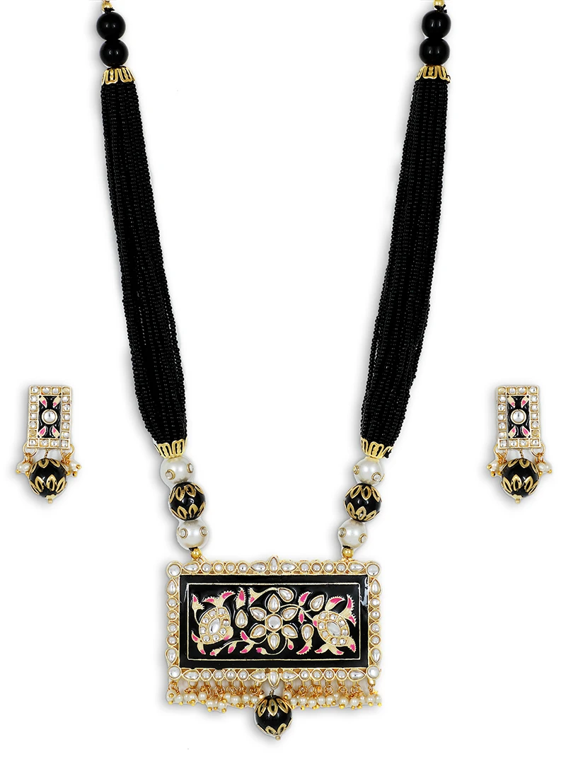 Gold plated beads necklace set with black beads all over and white stones studded on the black meenakari enameled pendant. Comes with matching pair of earrings.The dimension of the actual product is ,necklace height is 25.6 cm, weight is 145 gms ,width is 5.9.Earring length is 4 cm, width is 1.6 cm.