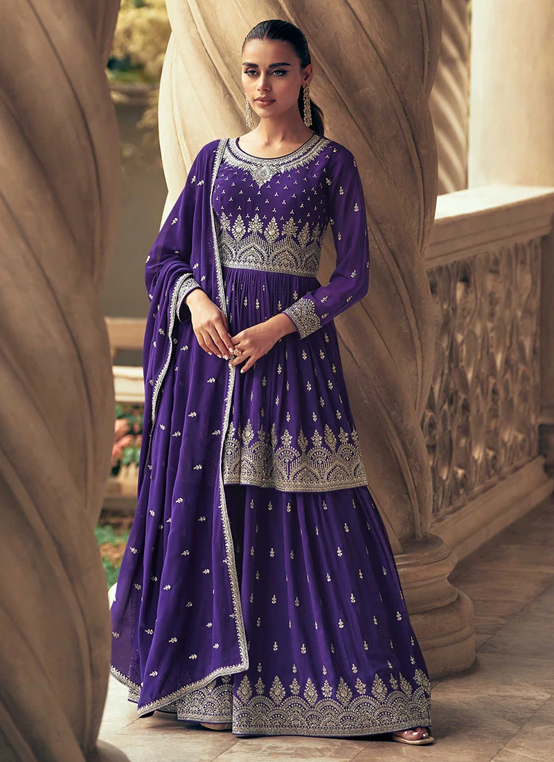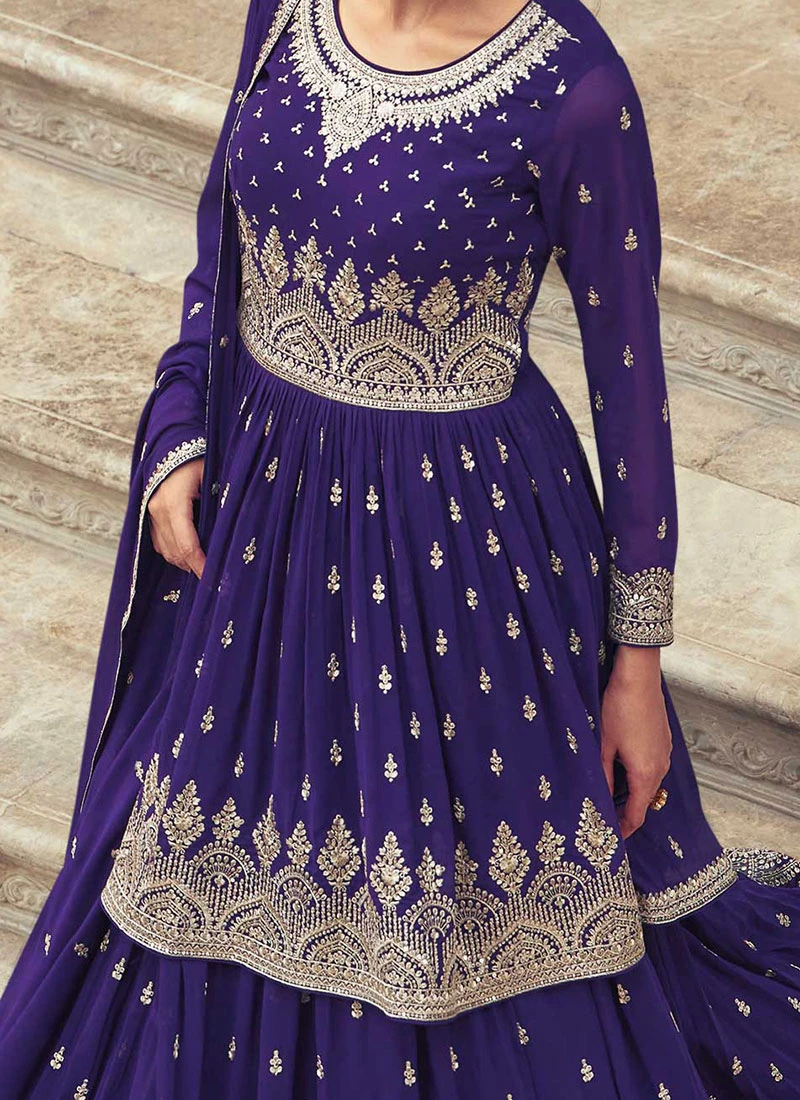 In summary the Violet Faux Georgette Embroidered ALine Lehenga is a masterpiece of craftsmanship and design. Its rich violet colour intricate embroidery and comfortable silhouette make it a timeless choice for women who want to exude grace and charm at special events. This lehenga is a testament to the enduring appeal of traditional Indian attire with a modern twist offering a seamless blend of elegance and style.