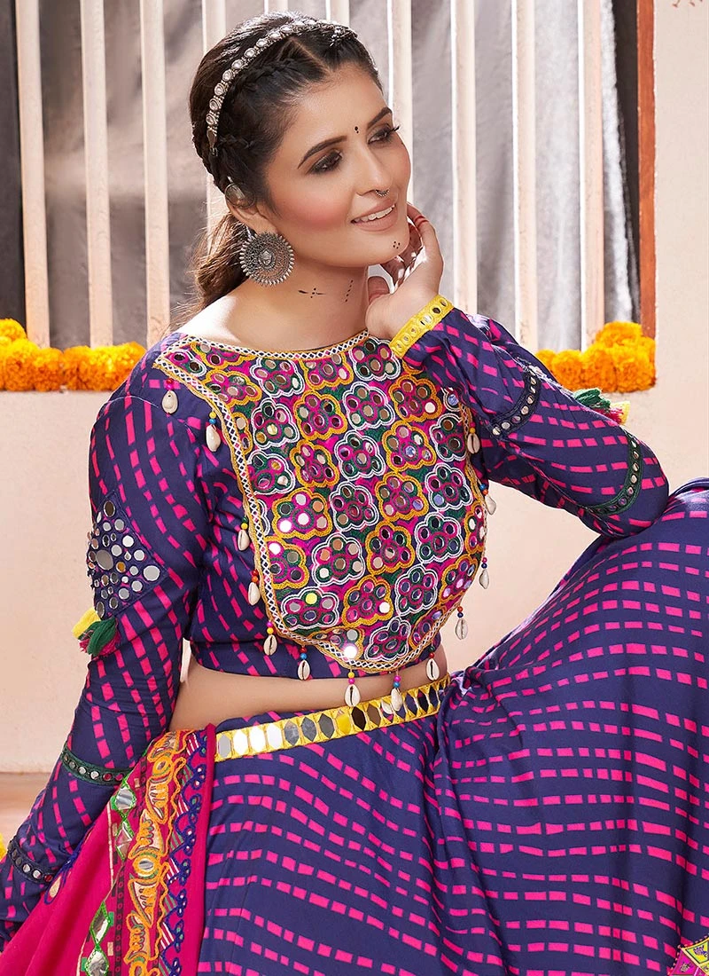Chaniya Choli also known as Ghagra Choli is a traditional attire originating from the colourful state of Gujarat in India. It consists of three main components the Chaniya flared skirt Choli and a Dupatta . This particular ensemble is crafted from highquality viscose fabric known for its luxurious feel softness and drape. Viscose is a breathable and lightweight material that ensures comfort even during long hours of wear making it ideal for festive occasions.