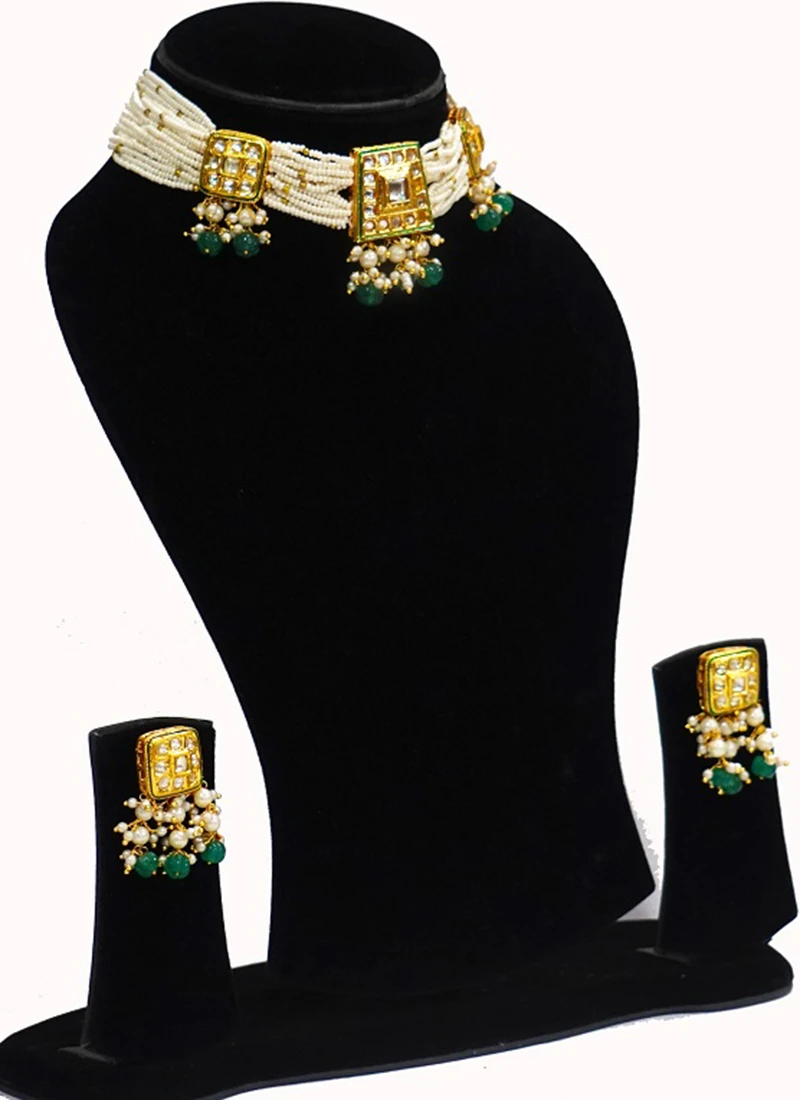 Whether worn at a grand celebration or an intimate gathering the White Green Chokar Set is bound to make a statement. It is more than jewellery it is a work of art that tells a story of craftsmanship tradition and timeless beauty. With every pearl and gemstone meticulously chosen and every design element thoughtfully crafted this chokar set is a treasure to behold a masterpiece that transcends time and captivates the heart.